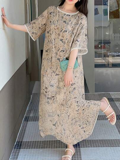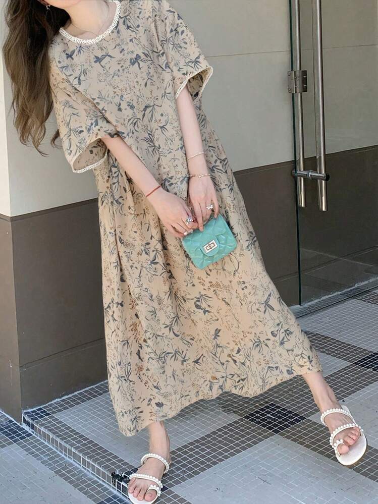 FRIFUL فستان طباعة الزهور بياقة مستديرة وأكمام قصيرة وفضفاض، فستان صيفي للعودة إلى المدرسة